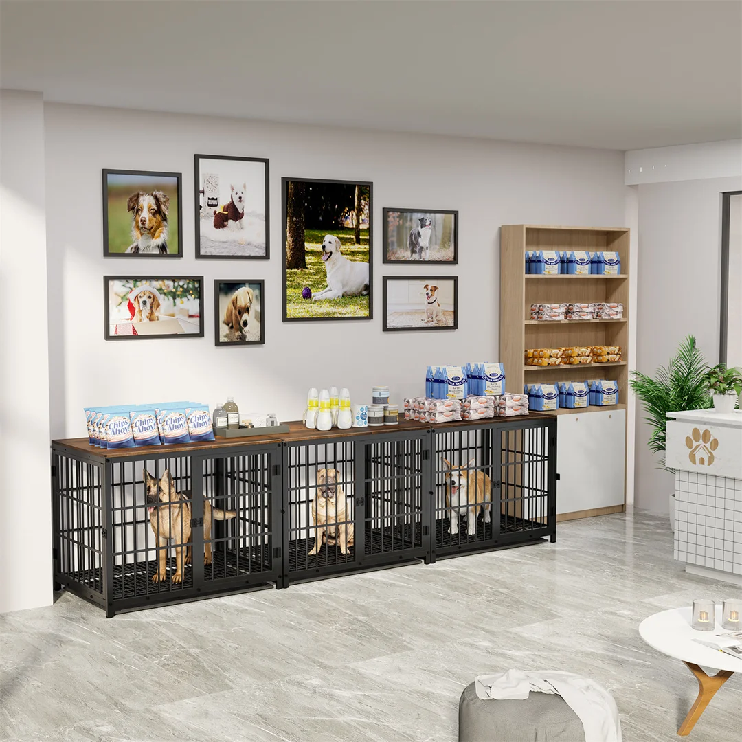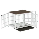 Blend comfort, safety, and style with this beautifully designed furniture-style dog crate. Featuring elegant wood finishes paired with a sturdy black metal frame, it fits seamlessly into your home while giving your dog a secure and cozy place to rest. The three-door design makes access easy from any angle, and the removable tray allows for simple, stress-free cleaning. Suitable for small, medium, and large dogs, this crate offers a calm, welcoming space your pet can truly feel at home in.
